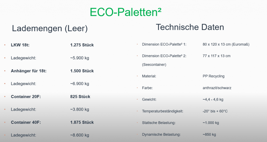 • Reduzieren Sie Ihre Exportkosten und schöpfen Sie die Seecontainer zu 100% aus, in dem Sie keine Europaletten, sondern ECO-Paletten² mit 77x117x13 und 4,4 kg Gewicht einsetzen