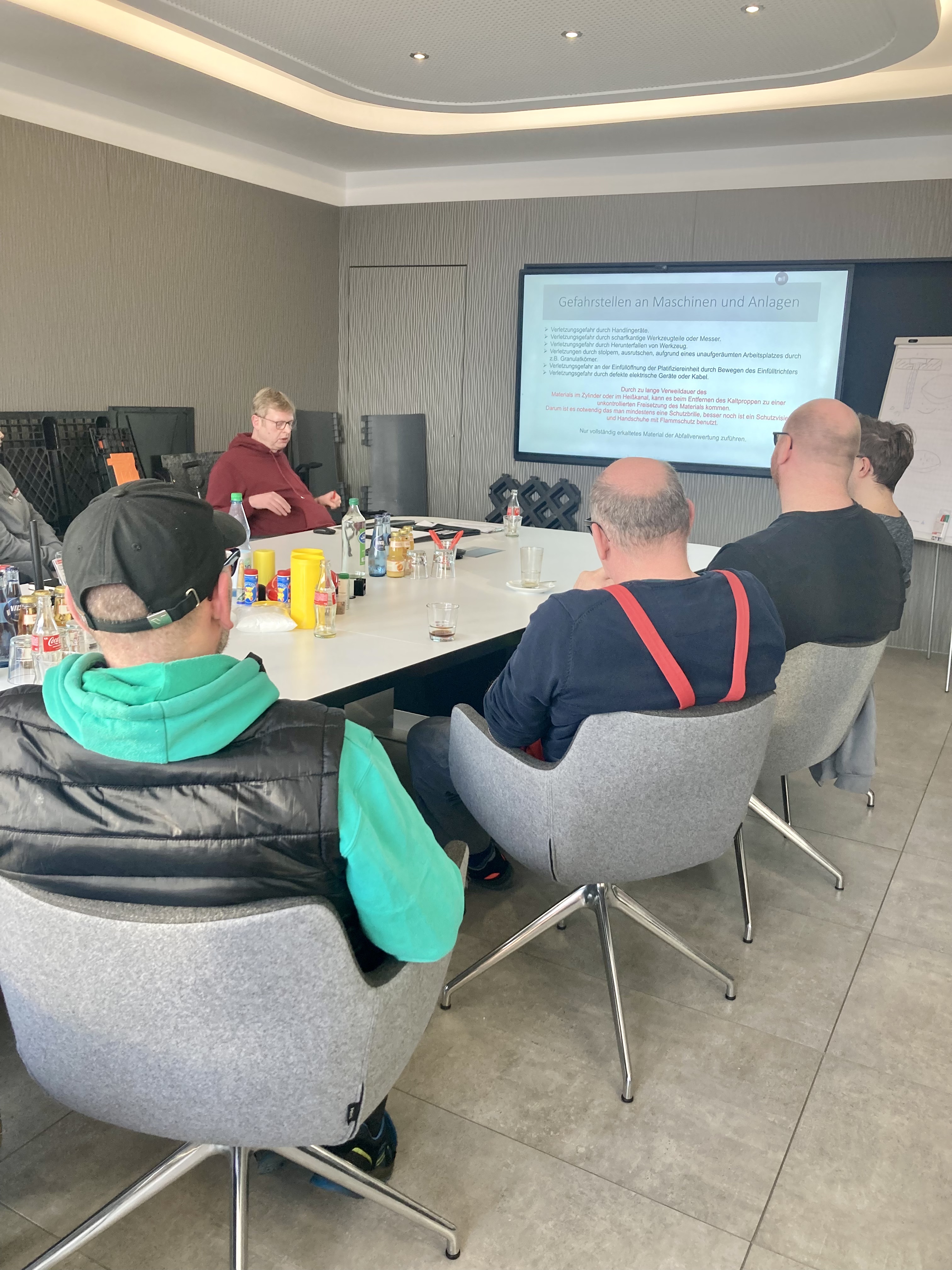 Alle neuen Kolleginnen und Kollegen erhalten zu Arbeitsbeginn eine Sicherheitseinweisung, die wir mit allen Mitarbeitenden jährlich auffrischen – wie jetzt kürzlich wieder geschehen, unter der Regie unseres Leiters der Qualitätssicherung, Ludger Thomann, der auch Mitglied im Arbeitssicherheitsauschuss ist.
